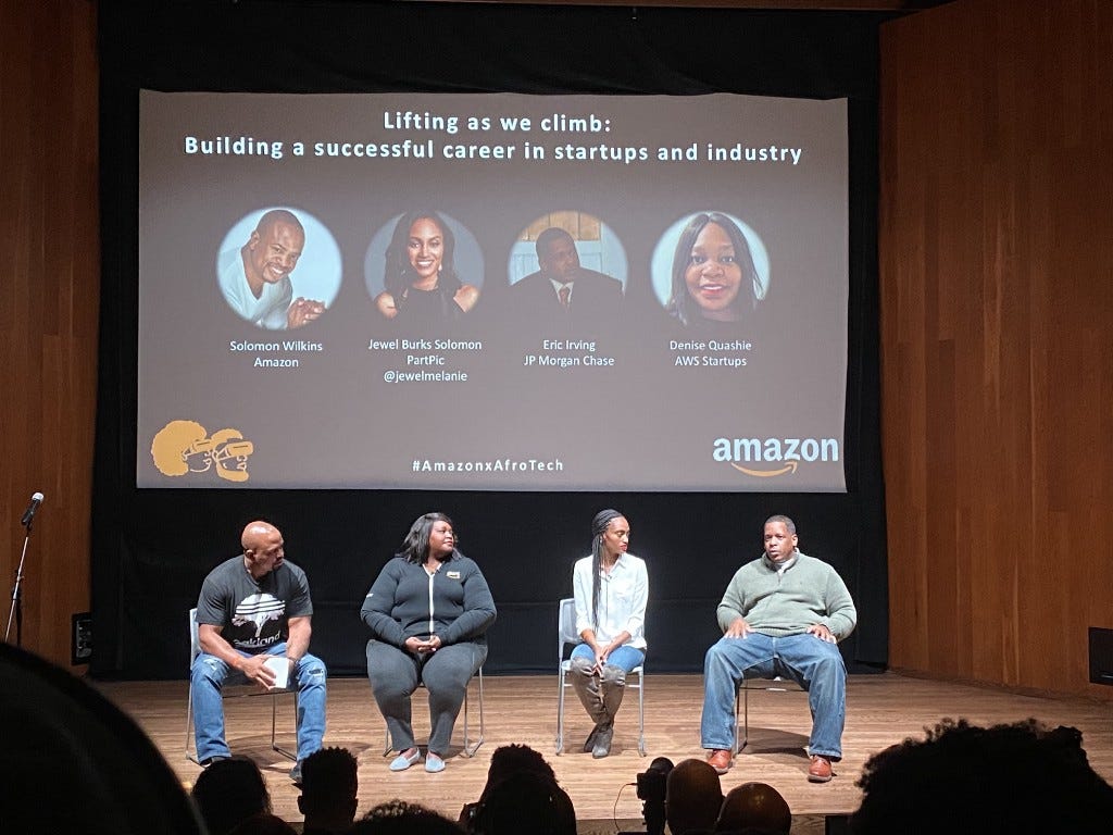 The panel included Denise Quashie, Jewel Solomon, Eric Irving (JP Morgan), and was moderated by Solomon Wilkins an Oakland native and Amazon employee. They all spoke about their stories, journeys as entrepreneurs and being Blacks in Tech. Denise & Jewel actually both had startups that were acquired (Jewel’s by Amazon). Some notable quotes from the event: